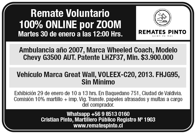 Exhibición Martes 18 de Junio de 11 a 17 hrs. En Av Ecuador #2463, Valdivia.